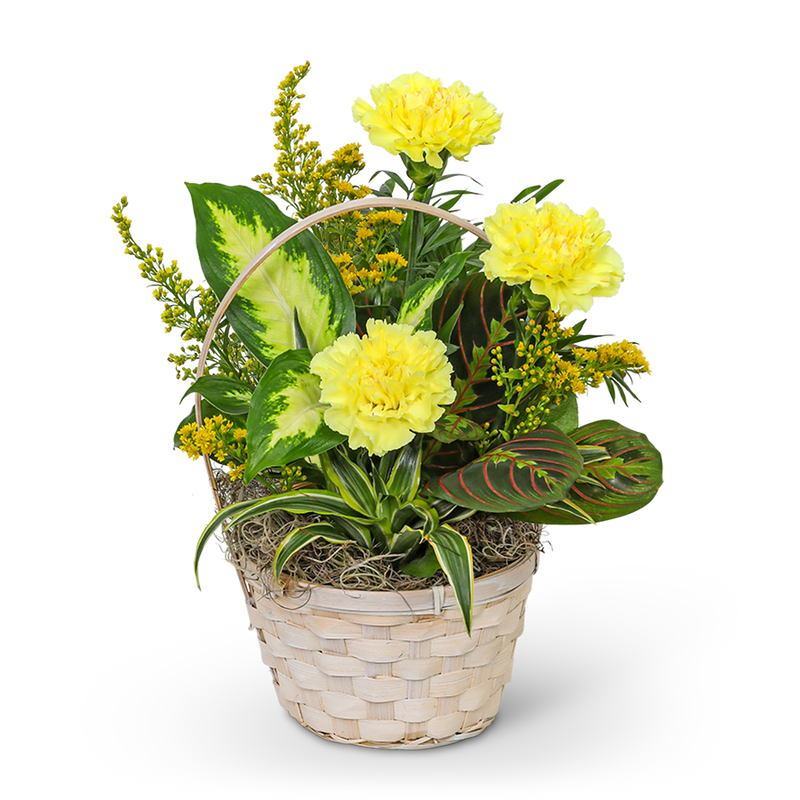 This beautiful dish garden features a variety of green plants, as well as yellow carnations and to add a pop of color. Whether you're celebrating a birthday, sending a sympathy gift, or just want to brighten someone's day, our Dish Garden with Yellow Florals is a perfect choice! As a local florist offering flower and plant delivery services, we're proud to provide our customers with the highest quality products and customer service.