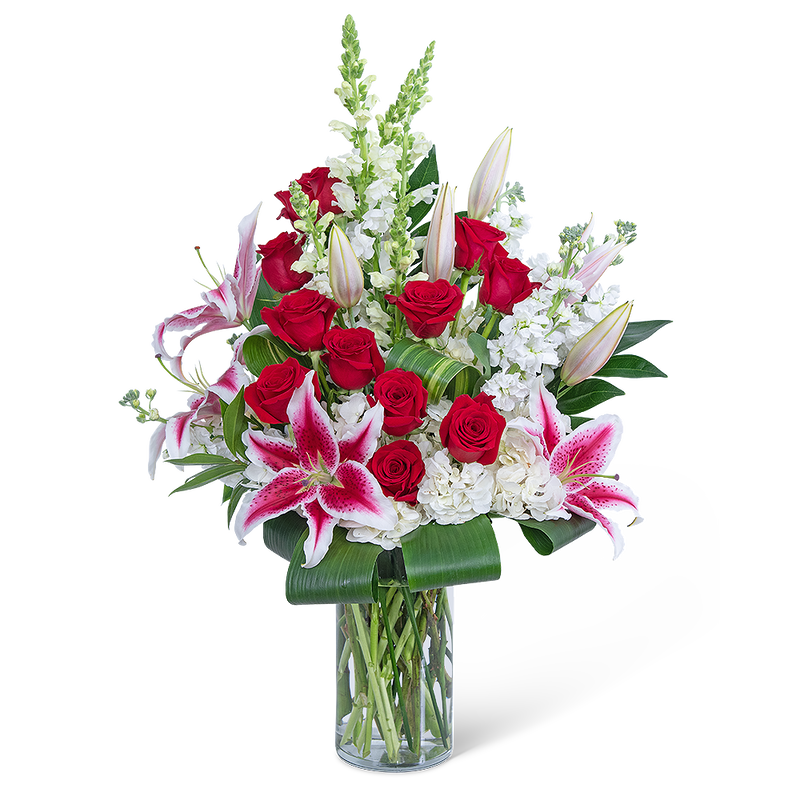 Endless Love Story is a "wow" arrangement! It is ultimate beauty and perfection! It features a dozen roses, Lilies, Hydrangea, Snapdragons, Stock, Aspidistra, and other premium foliage. Roses symbolize love and hope and are the perfect anniversary gift. Lilies symbolize happiness and purity of heart, which makes this design a shop and customer favorite.