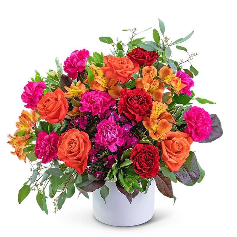 Wouldn't it be paradise to receive this colorful arrangement? Endless Paradise is a vibrant collection of Myra and orange roses, carnations, alstroemeria, and dianthus accented with a variety of foliage in a white ceramic container. This eye-catching piece would add a pop of color to any entryway or dining room table.