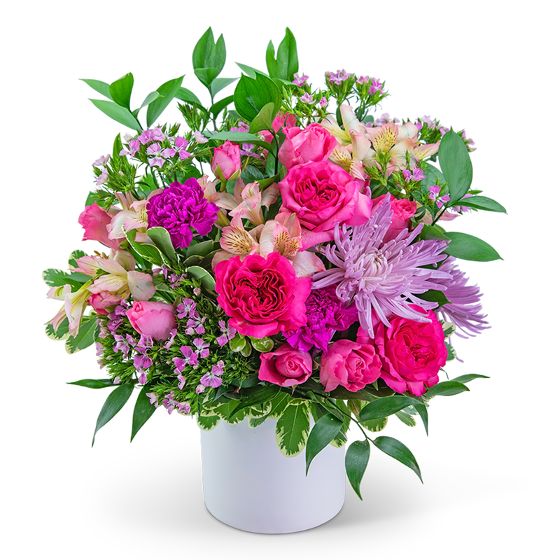 Who wouldn't love to spend time in a beautiful English garden? You can do just that with this arrangement containing Pink roses, stem spray roses, dianthus, alstroemeria, spider mums, carnations, ruscus, and pittosporum in a white ceramic container. English Garden will be a stunning addition to any entryway or coffee table.