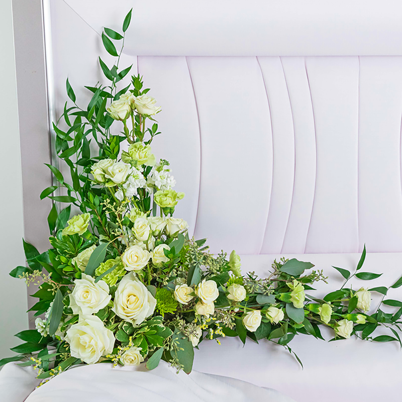 This all-white arrangement is a wonderful accent for the corner of the casket. It is filled with roses, spray roses, miniature carnations, and a variety of fresh foliage. This piece complements the Eternal Peace Collection