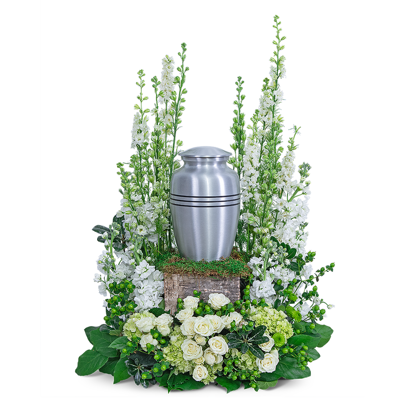Our Eternal Peace Surround is a stunning memorial to surround a loved one's urn at a funeral or Celebration of Life Ceremony. White spray roses, mini green hydrangea, larkspur, stock, hypericum, and premium foliage come together to create a harmonious design. Memorial flowers bring healing to family and friends and are the perfect way to honor and celebrate a loved one's life.