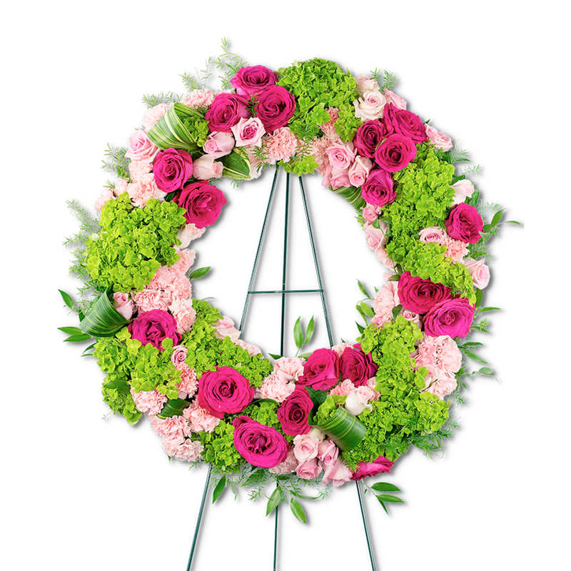 How do you express the gratitude you feel for having known and been a part of such a beautiful life? Our Eternally Grateful Wreath is absolutely gorgeous, with bright and soft pink roses, pink carnations, green hydrangea, and premium greens. The circular shape of the wreath represents eternity. A deep or hot pink rose can convey gratitude, appreciation, recognition and is a great way to say 'thank you,' while a light or pale pink rose conveys grace, gentleness, joy and happiness. Funeral flowers can bring healing in many ways.