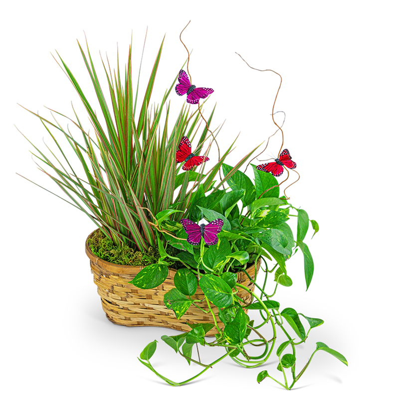 Studies have proven that having plants in your home boost your mood and your health. We specialize in local plant delivery, so send your love with our long-lasting Ethereal Garden Basket! This low-maintenance beauty features a Dracaena Plant and Pothos plant, nestled together in a large basket and accented with butterflies and curly willow. This gift is both easy to care for, decorative, and is also great for purifying the air, so place your order today for this stylish favorite!