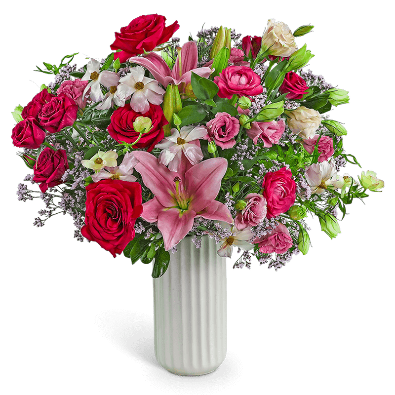 Euphoria Fields is a lush floral design of Roses, Lilies, Ranunculus, Lisianthus, and accent blooms and foliage in a rich palette of pink and red. Designed in a modern white vase, it's a great choice for birthday surprises, flower delivery just because, or any joyful occasion. Substitutions may be made based on availability while preserving the overall look of the arrangement.