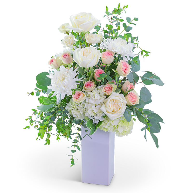 Awaken the senses as you walk into your own romantic floral fairytale! Traditional roses, contemporary mums, and playful hydrangea mix to create a stunning bouquet! Fairytale Ending is bursting with blossoms and arranged in an eye-catching white ceramic vase, accented with premium foliage. A staff favorite, this timeless beauty is perfect for any occasion!