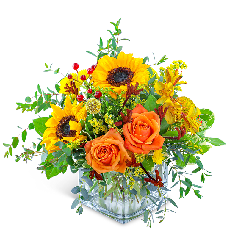 Falling in Thyme is a beautiful hand-arranged bouquet that will deliver sunlit happiness to someone's doorstep. It has a mix of colorful blooms, like Roses, Sunflowers, Mums, Craspedia, Alstroemeria, and premium foliage in a clear glass vase. Whether celebrating a birthday, new baby, or retirement, this arrangement will add just the right touch of warmth to your celebration.