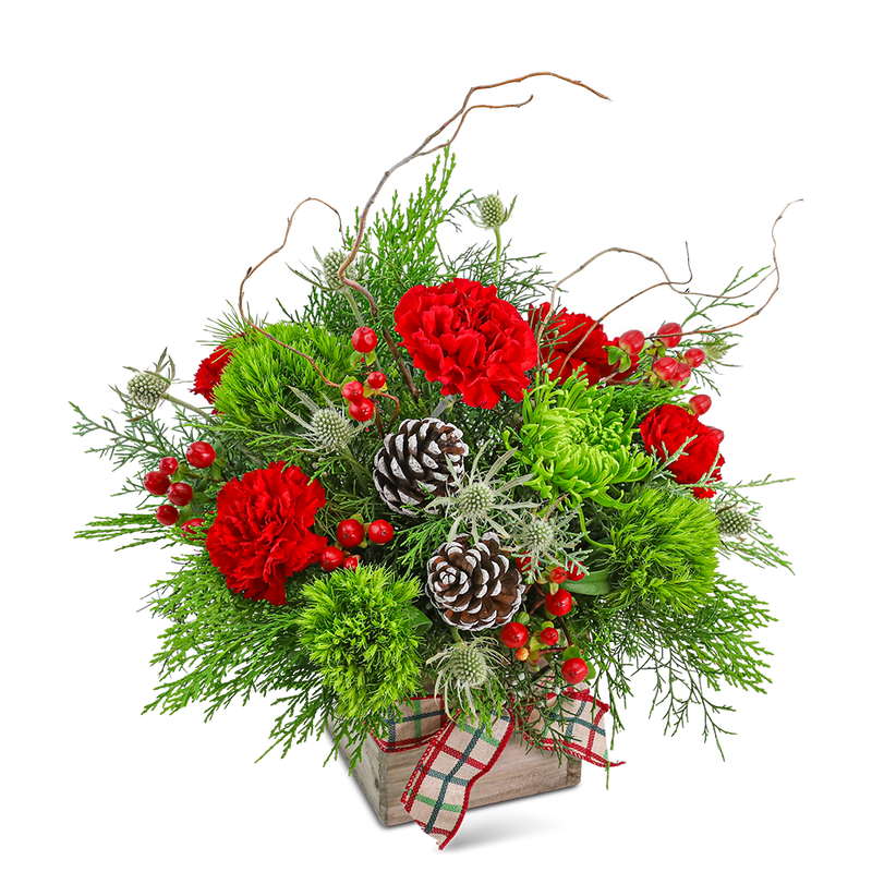 Embrace the spirit of the season with our Festive Tidings floral design. It features vibrant red carnations, Green trick Dianthus, Spider Mums, Pinecones, Curly Willow, and lush foliage elegantly presented in a charming wooden cube. Adorned with a festive plaid ribbon, this arrangement exudes rustic holiday charm and is a heartwarming addition to any holiday celebration.
