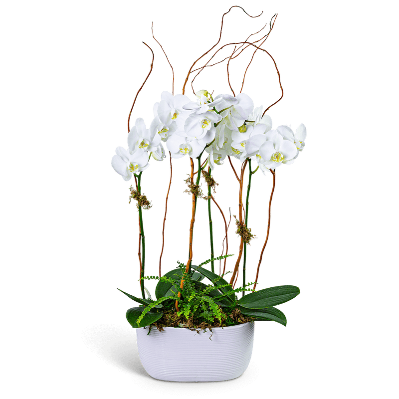 The Fifth Avenue Triple Orchid showcases three graceful orchids paired with curly willow branches in a sleek ceramic container. It's an effortlessly elegant addition to any space and is available for local flower delivery. Please note, orchid colors may vary with the seasons.