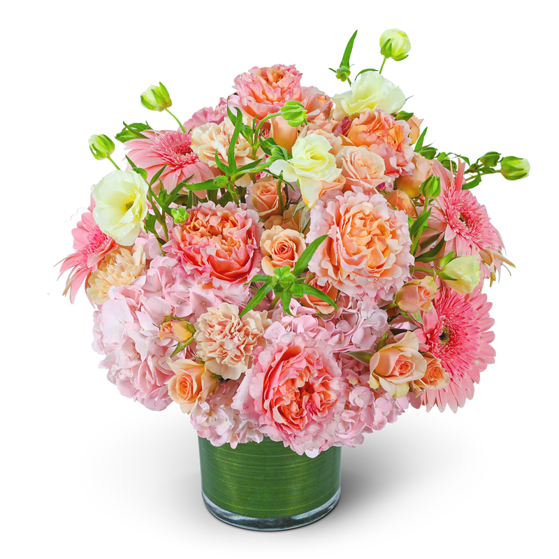 Fluttering Farewell is a captivating flower design that offers a touching tribute to a loved one. Filled with premium blooms such as roses, Gerbera daisies, carnations, and hydrangeas in soothing shades of pink and peach, this sympathy flower arrangement is expertly arranged in a leaf-lined container, conveying a message of comfort and support during a difficult time.
