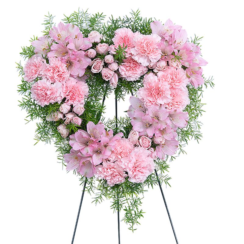 Pink carnations symbolize thoughts of remembrance, while pink roses are a sign of appreciation and grace. We bring together these beautiful pink flowers in a stunning design we call our Forever Adored Standing Heart. It features delicate pink spray roses, carnations, Alstroemeria, Springeri, and premium foliage. Forever Adored Standing Heart is the perfect sympathy design to send to a funeral or a grieving family to let them know their loved one will be forever adored and remembered.