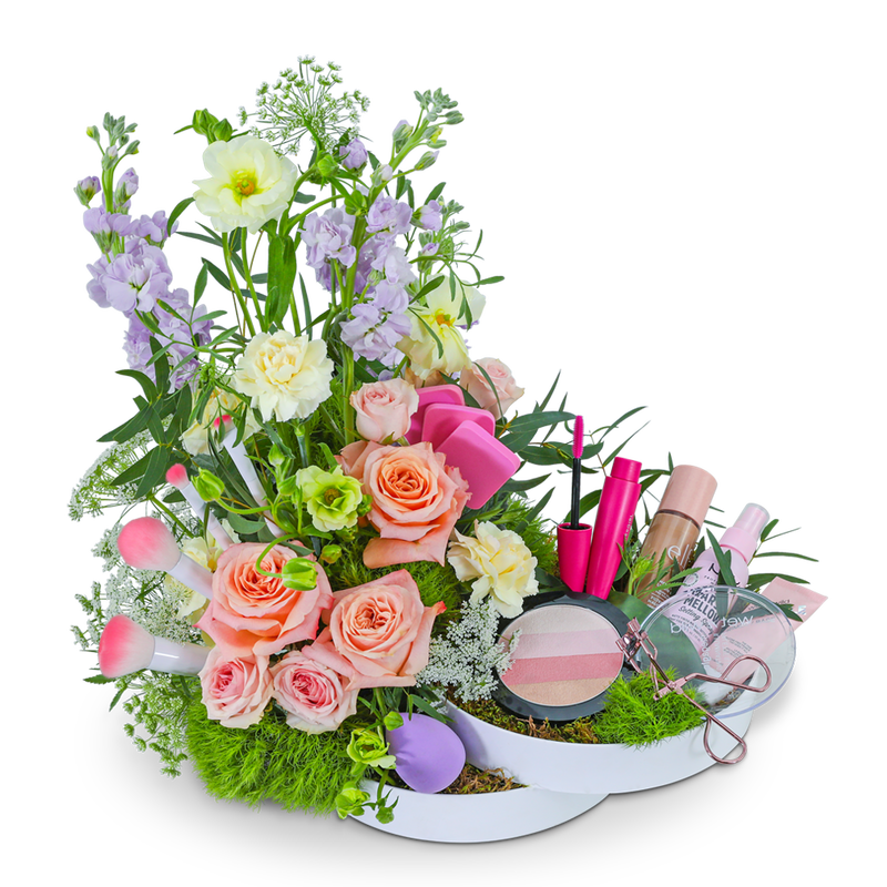 Our Forever Glam floral design combines the classic beauty of fresh roses, carnations, stock, and premium flowers with beauty products. This exquisite arrangement effortlessly marries the natural beauty of flowers with the indulgence of beauty items, making it the perfect gift or memorial. Whether for a special occasion or to honor the memory of someone dear, Forever Glam is sure to leave a lasting impression of elegance and beauty.