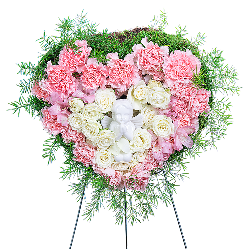 Pink carnations symbolize thoughts of remembrance, while white roses are a symbol of purity and innocence. We bring together these beautiful flowers in a stunning design we call Forever Our Angel Standing Heart. It features delicate pink carnations, white spray roses, Alstroemeria, and Springeri. In the center, we place a keepsake cherub as a symbol of the little angel, gone too soon. Forever Our Angel Standing Heart is the perfect sympathy design to send to a funeral or a grieving family to let them know their little angel will be forever remembered.