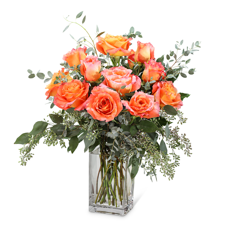 Free Spirit roses know no bounds! They are a long-lasting treat for the senses. Their unique tones of color range from orange, peach, persimmon, and pink, often all in one bloom! Their scent will fill and brighten any room. This design features a dozen Free Spirit Roses, accented with complementing green foliage. This design is perfect for any occasion!