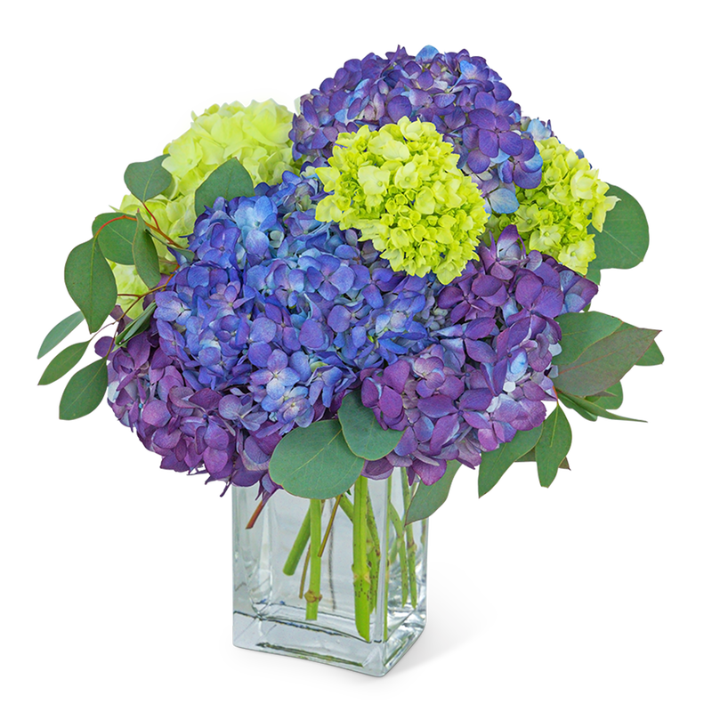 A beautiful bouquet with Hydrangeas is a classic and timeless flower arrangement for any occasion. French Country Home simply features beautifully purple-tinted and mini green Hydrangeas, accented with Eucalyptus, in a clear vase. Our Floral Shop specializes in local flower delivery, so let us make someone's day with our beautiful Hydrangea bouquet delivered right to their front door or office.