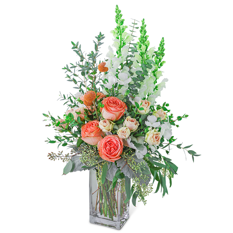 This stunning piece will add a touch of class to any space! Fresh Honeycrisp contains roses, snapdragons, carnations, and Crespedia, accented with premium foliage, and displayed in a tall clear vase. This arrangement will look perfect on any entry or dining table.