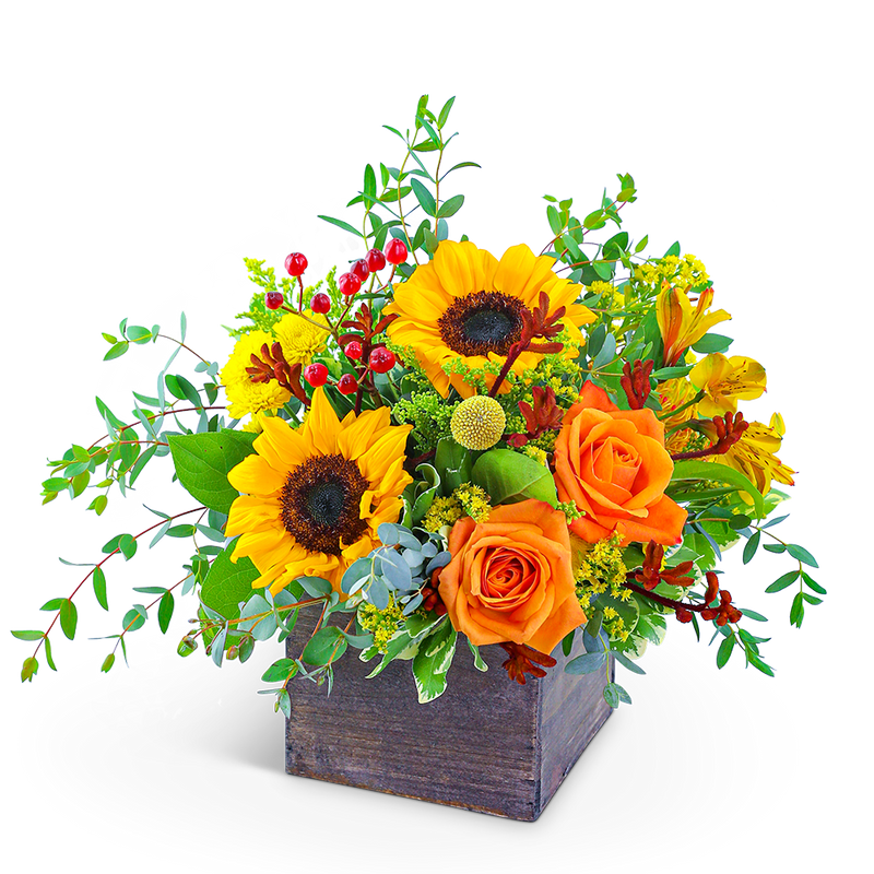 Fresh Thyme is a beautiful hand-arranged bouquet that will deliver sunlit happiness to someone's doorstep. It has a mix of colorful blooms, like Roses, Sunflowers, Mums, Craspedia, Alstroemeria, and premium foliage in a wooden cube. Whether celebrating a birthday, new baby, or retirement, this arrangement will add just the right touch of warmth to your celebration.