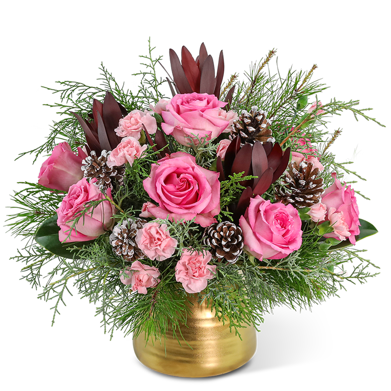 Elevate the holiday cheer with our Gilded Blush Forest flower arrangement, a stunning design featuring Pink Roses, Carnations, leucodendrons, and premium winter foliage nestled in a beautiful gold vase. Sending this elegant arrangement as a gift is a sure way to bring joy and enchantment this holiday season.