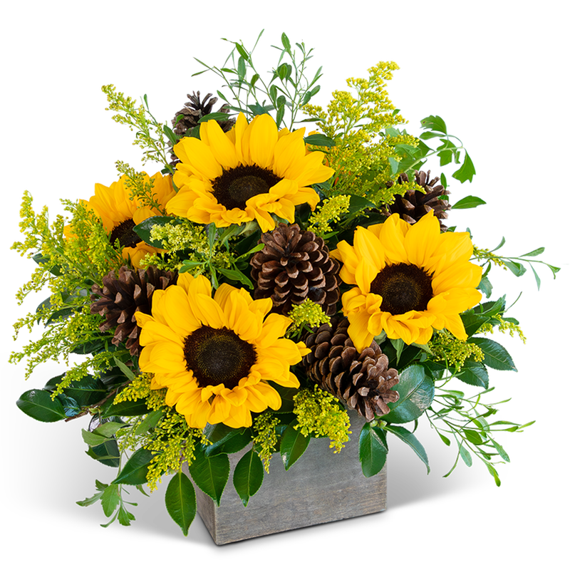 Bask in the warm radiance of the Glowing Harvest Beauty flower arrangement, showcasing stunning sunflowers, rustic pine cones, and lush premium foliage elegantly designed in a charming wooden cube container. This blend of vibrant blooms and natural elements captures the essence of the season, making it a perfect centerpiece to bring a touch of autumnal beauty to any space.