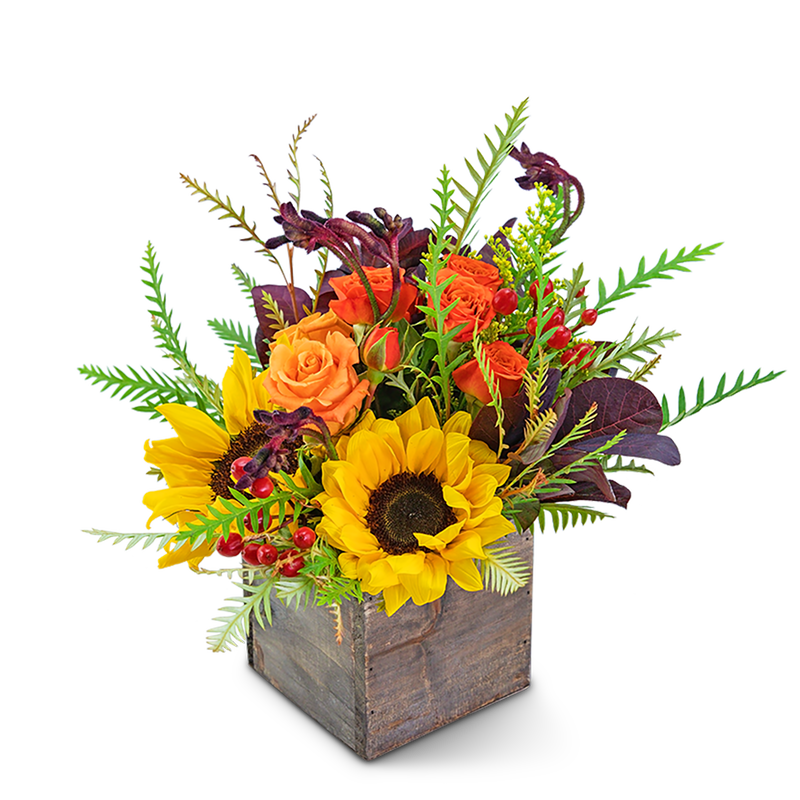 Capture the golden glow of the sun in this arrangement. Golden Canyon features roses, sunflowers, kangaroo paw, hypericum berry, solidago, leucodendron, and grevelia in a charming wooden box. This bouquet will add just the right touch of warmth to a side table or desk .