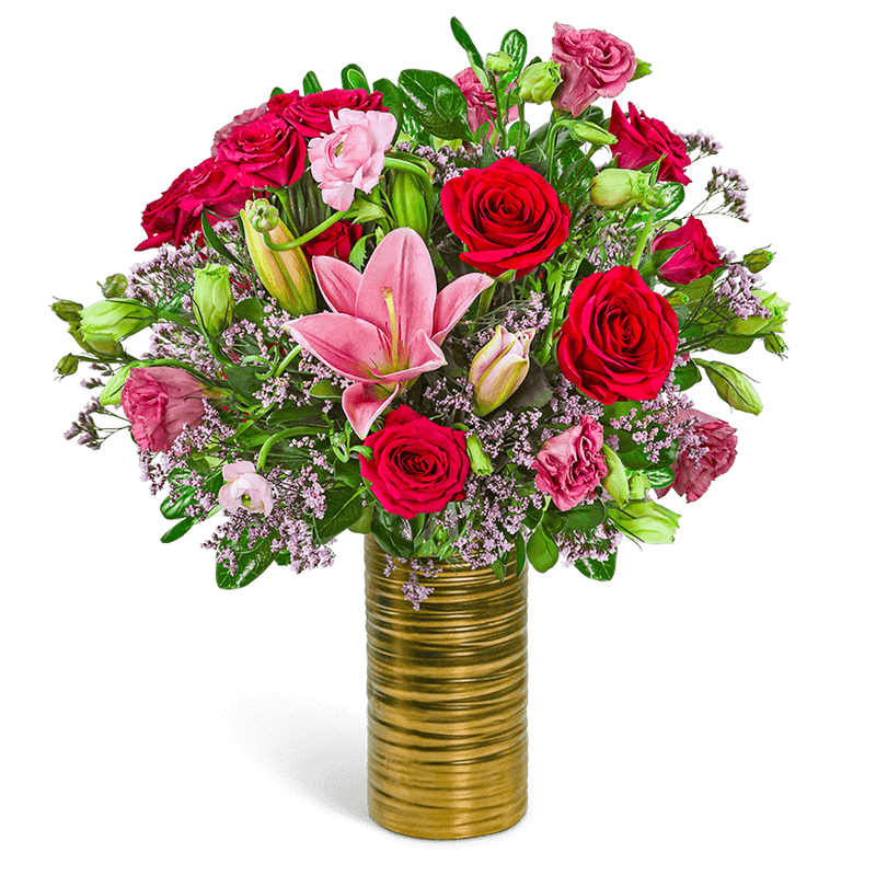Golden Euphoria is a lush floral design of Roses, Lilies, Ranunculus, Lisianthus, and accent blooms and foliage in a rich palette of pink and red. Designed in a tall golden vase, it's a stunning choice for anniversary surprises, flower delivery just because, or any joyful occasion. Substitutions may be made based on availability while preserving the overall look of the arrangement.