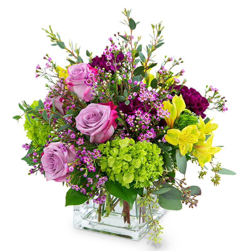 Are you wanting to send a sweet sentiment or gift? Our Golden Plum design features long-lasting Alstroemeria, purple carnations and roses, hydrangea, premium foliage, and wax flower accents. Golden Plum is a lovely way to send your love and appreciation! It will be the perfect complement to a home or office and will look stunning on a coffee table or desk.