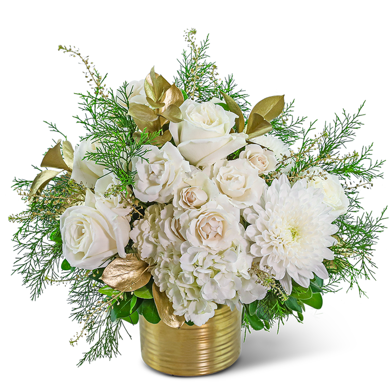 Illuminate the winter season with our Golden Winter Elegance floral design. Featuring a stunning combination of White Roses, Hydrangea, Cremon Mums, and gold accented foliage elegantly displayed in a shimmering gold cylinder vase, this design exudes sophistication and luxury. A harmonious blend of premium blooms and exquisite foliage, this arrangement is the perfect gift to complement someone's holiday decor with its air of opulence and warmth.