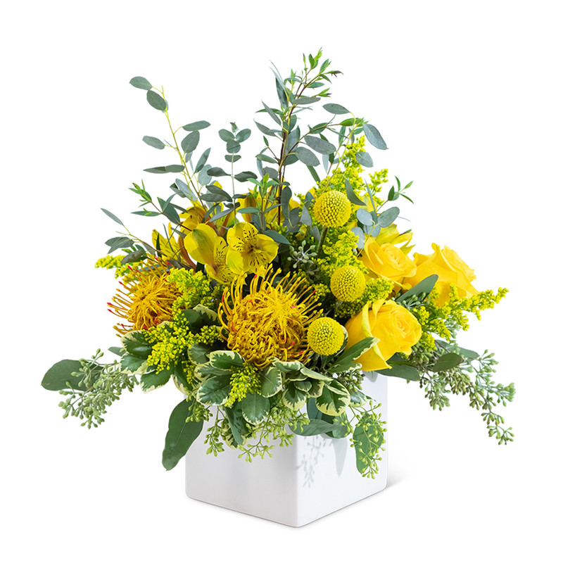 Grand Radiance is the perfect design for a housewarming, birthday, or get well gift. This magnificent and bright design is thoughtfully arranged with yellow roses, alstroemeria, pincushion protea, Craspedia, and solidago, accented with varieties of eucalyptus. This beauty is sure to make someone's week, as it will have long-lasting blooms, brightening their home or office space.
