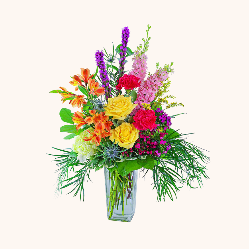 Fresh-picked from the Garden is a classic bouquet that instantly lifts your spirits. Our florists hand-design this bright and cheerful arrangement, blooming with Liatris, Larkspur, Roses, Carnations, Alstroemeria, Dianthus, Hydrangea, and premium foliage. Bring a taste of the outdoors into your home with our Fresh-Picked Bouquet. It's perfect for a get-well, birthday, or anniversary gift!
