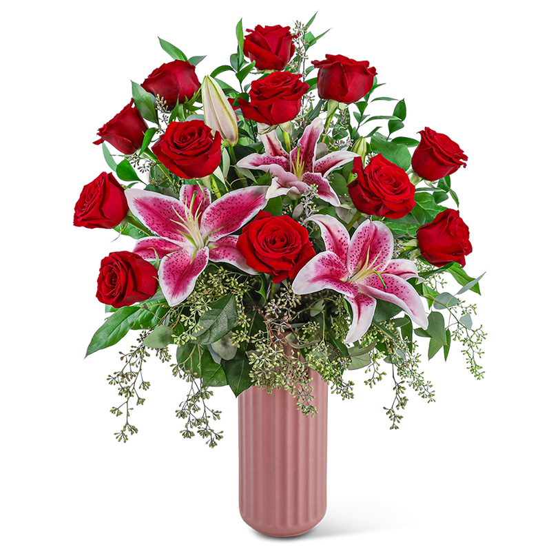 Embrace the timeless essence of love with Happily Ever After, a beautiful floral arrangement showcasing a mix of roses, lilies, and premium foliage in a sleek and modern vase. There's nothing more romantic than the classic gesture of sending roses, and this exquisite floral design serves as the perfect romantic gift to celebrate an anniversary or to express your love in an elegant way.