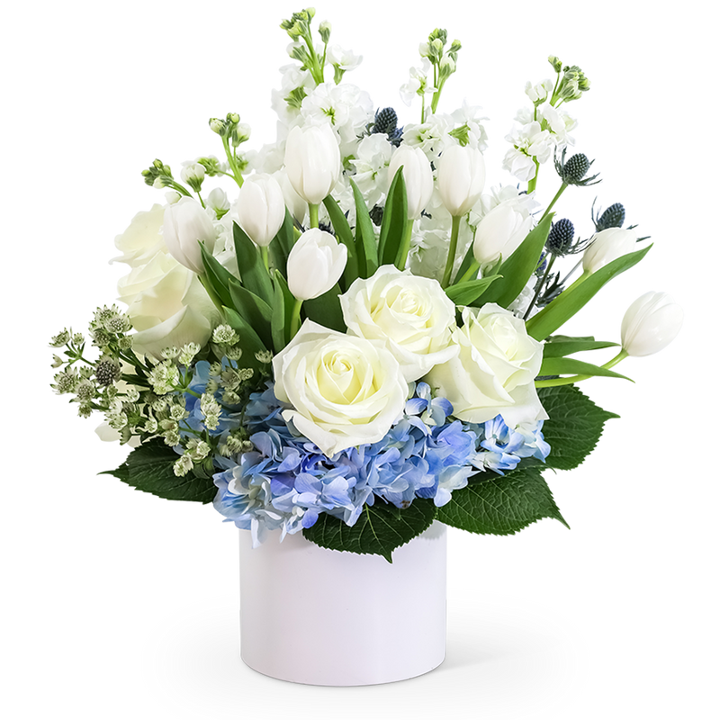 Who wouldn't want a Harmony Garden in their home or office? Everyone around will appreciate the beauty and fragrance of this magnificent floral piece. This refreshing floral arrangement features long-lasting white roses, tulips, stock, astrantia, and eryngium. Harmony Garden is the perfect gift for a birthday, get well, or anniversary present to make your loved one feel extra special.
