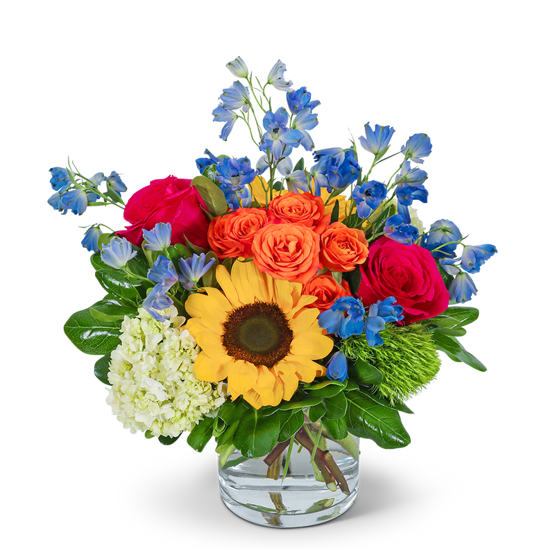 Experience the vibrance of our Havana Blooms flower design, an explosion of bright, bold colors that will infuse any space with energy and joy. This exuberant arrangement showcases a kaleidoscope of hues from the rainbow, featuring a mix of sunflowers, roses, hydrangeas, delphiniums, green trick dianthus, and lush foliage. Perfect for birthdays, anniversaries, or any occasion that calls for a burst of joy, the Havana Blooms flower design is a show-stopping gift that will leave a lasting impression.