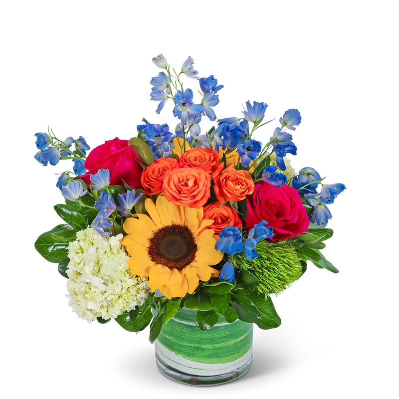 Experience the vibrance of our Havana Heat flower design, an explosion of bright, bold colors that will infuse any space with energy and joy. This exuberant arrangement showcases a kaleidoscope of hues from the rainbow, featuring a mix of sunflowers, roses, hydrangeas, delphiniums, green trick dianthus, and lush foliage. Perfect for birthdays, anniversaries, or any occasion that calls for a burst of joy, the Havana Heat flower design is a show-stopping gift that will leave a lasting impression.