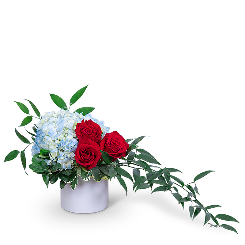 Heroic is a popular choice for flowers for Memorial Day or Independence Day and is beautifully shown in red, white, and blue flowers. This patriotic theme is accomplished with Roses, Hydrangea, and other premium foliage in a classic white ceramic container. Our Heroic design would also be a beautiful tribute to send for a military funeral or for the funeral of a veteran.