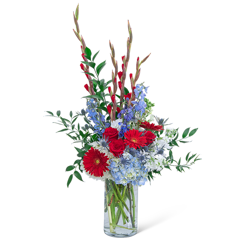 Hero's Journey is a popular choice for flowers for Memorial Day or Independence Day and is beautifully shown in red, white, and blue flowers. This patriotic theme is accomplished with Roses, Gerbera, Gladiolus, Hydrangea, Delphinium, Stock, and other premium foliage. Hero's Journey would also be a beautiful tribute to send for a military funeral or for the funeral of a veteran.