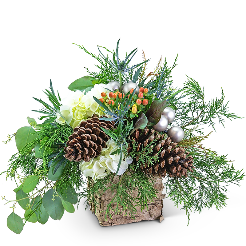 Bring a touch of the holidays to your home with this festive arrangement! Holiday Spirit features hydrangeas, eryngium, hypericum berries, and pinecones with assorted evergreen and foliage in a rustic birch box. It will look perfect on a side table or desk.