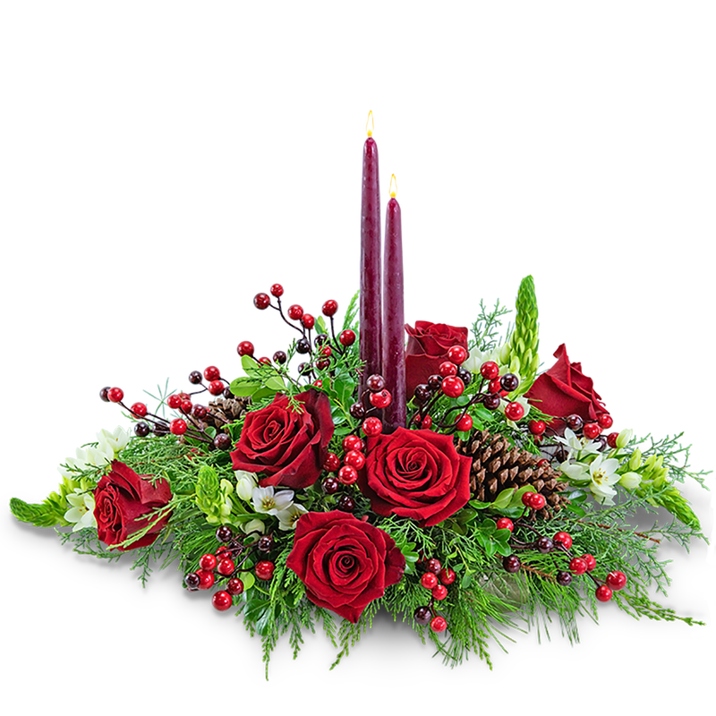 Oh, there's no place like home for the holidays! This delightful centerpiece features roses, Star of Bethlehem, pinecones, berries, and assorted evergreen surrounding 2 taper candles. Holidays at Home will add a festive glow to any table.