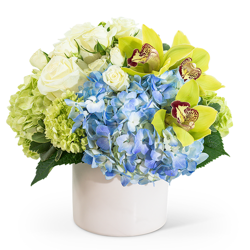 Home Garden with Orchids is a full and lush design that would make anyone's day! It is a customer favorite, with blue and green full size and mini hydrangea, white roses and spray roses, and green cymbidium orchids in a modern white container. It fits well on a dining room or coffee table and would make a great anniversary or birthday gift.