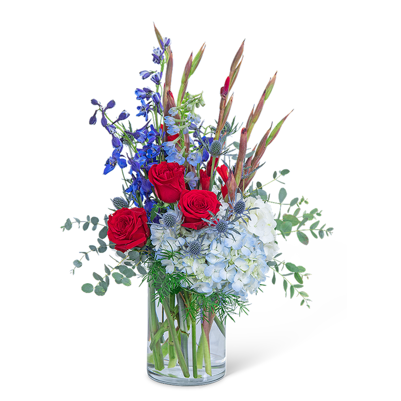 Home of the Brave is a popular choice for flowers for Memorial Day or Independence Day and is beautifully shown in red, white, and blue flowers. This patriotic theme is accomplished with Roses, Gerbera, Gladiolus, Hydrangea, Delphinium, Stock, and other premium foliage. Home of the Brave would also be a beautiful tribute to send for a military funeral or for the funeral of a veteran.