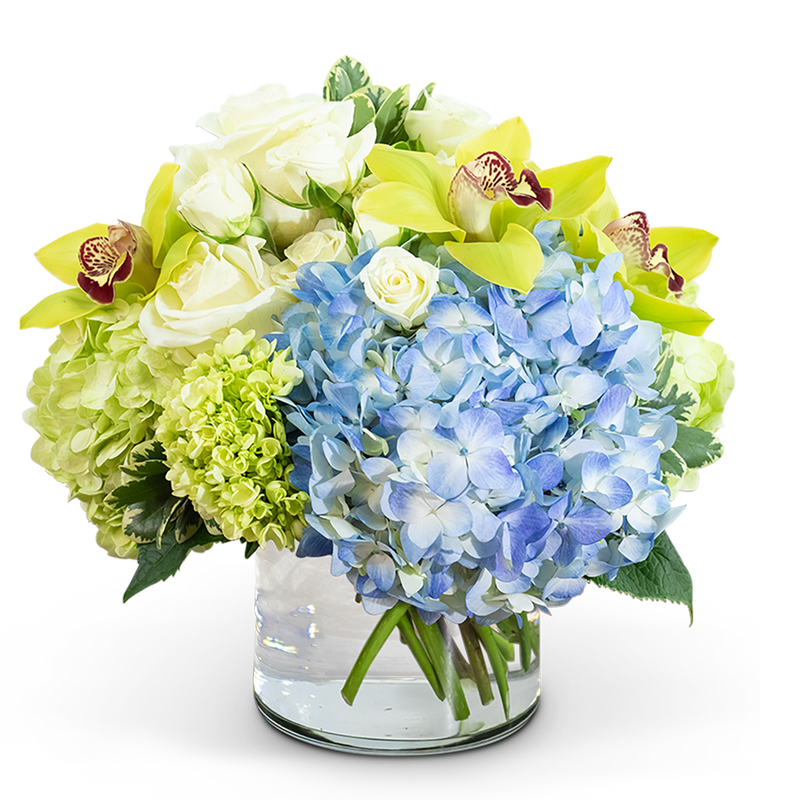 Home Sweet Home is a full and lush design that would make anyone's day! It is a customer favorite, with blue and green full size and mini hydrangea, white roses and spray roses, and green cymbidium orchids in a clear container. It fits well on a dining room or coffee table and would make a great anniversary or birthday gift.