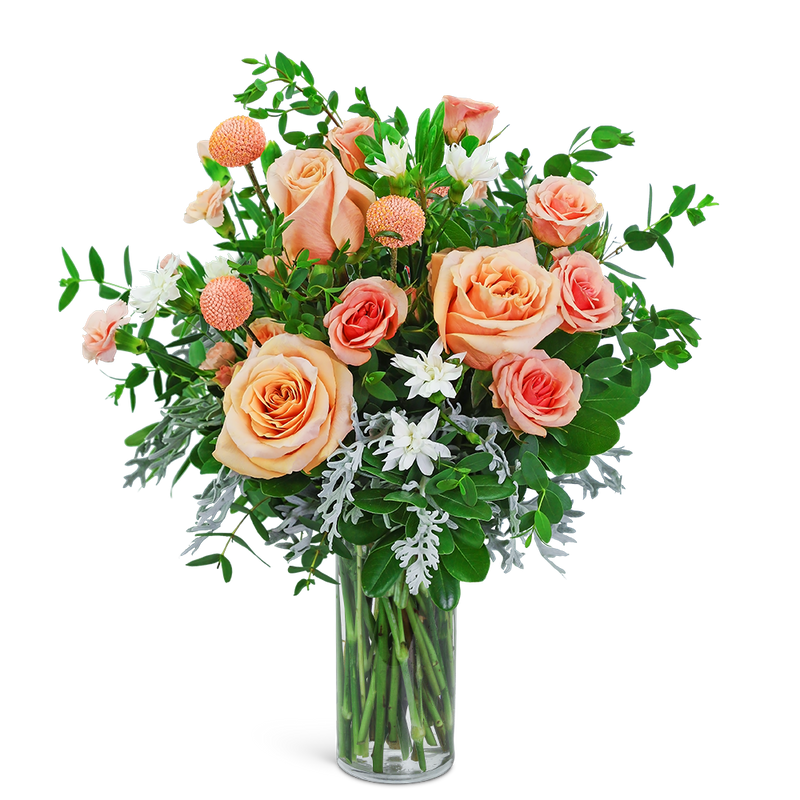 Our Honeycrisp Daydream design is a sweet way to show someone you care. Delicate peach roses bring life to this arrangement, as Carnations, Crespedia, and other premium flowers and foliage fill it out beautifully. If you're looking for a birthday or romantic gift that really expresses your love, look no further than our Honeycrisp Daydream design. We can offer same-day flower delivery in most cases.