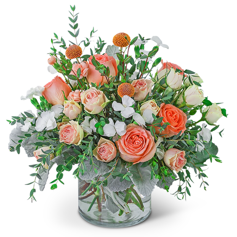 Who wouldn't love this stunning arrangement of peaches and creams? Honeycrisp Orchard contains roses, carnations, Crespedia, Dusty Miller, and Parvifolia. It will make the perfect birthday or anniversary gift!