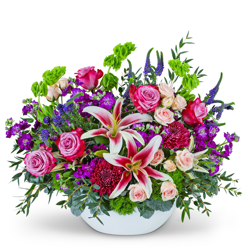 The Hyde Park Blooming flower design features a captivating blend of deep purples, pinks, and greens, exuding a sense of romance and elegance. This stunning arrangement includes roses, stock, lilies, cremons, and premium foliage artistically arranged in a white vase, making it a luxurious and sophisticated centerpiece that will add a touch of opulence to any space. Embrace the beauty of nature with Hyde Park, a harmonious combination of rich hues and exquisite blooms.