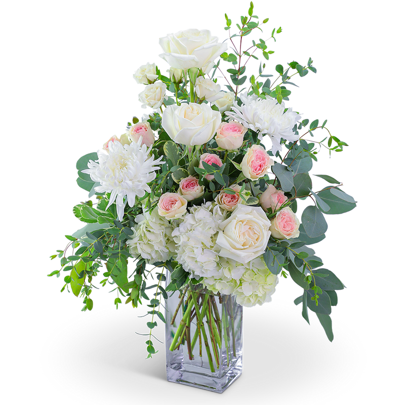 Awaken the senses as you walk into your own romantic floral fantasy! Traditional roses, contemporary mums, and playful hydrangea mix to create a stunning bouquet! I'm Blushing is bursting with blossoms and arranged in an eye-catching clear glass vase, accented with premium foliage. A shop favorite, this timeless beauty is perfect for any occasion!