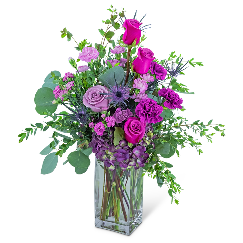 Escape to a tropical island with this arrangement of rich, warm tones. Isle of Tahiti features hydrangea, roses, carnations, dianthus, and premium foliage including Silver Dollar Eucalyptus, arranged in a tall, clear vase. This stately piece will be perfect on an entry or dining table.