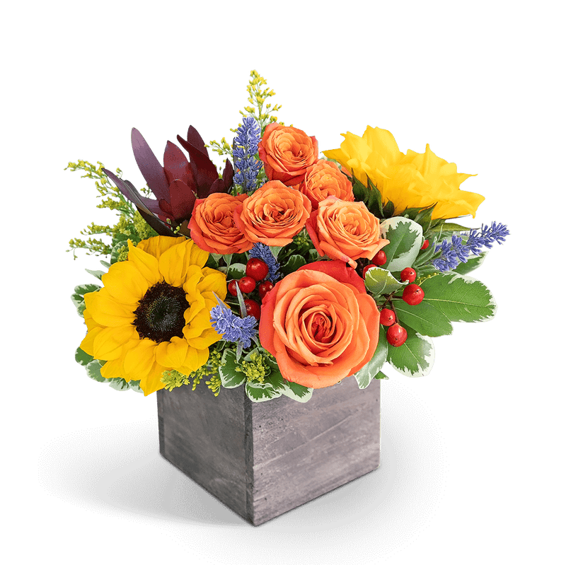 All the colors of fall are captured in Larchmont Canyon. This bright arrangement features roses, sunflowers, Leucodendron, hypericum berry, and premium foliage. Whether celebrating a birthday, a new baby, or the beauty of fall, this bouquet will add just the right touch of warmth. This burst of colorful flowers is designed by our florist in a wooden cube to create a gift that will truly shine.
