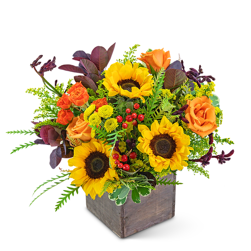 You'll hit just the right note with this charming arrangement! Laurel Canyon contains roses, sunflowers, kangaroo paw, button spray mums, hypericum berry, solidago, leucodendron, grevelia, and variegated pittosporum in a modern wooden box. Whether celebrating a birthday, anniversary, or any special occasion, this bouquet will add just the right touch of warmth.