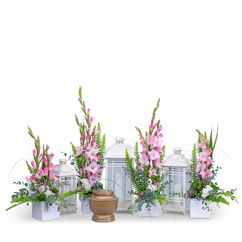 Our Light of Peace Tribute is the perfect tribute for cremations services or a Celebration of Life service to honor your loved one. It has three keepsake lanterns and four beautiful arrangements featuring roses, Gladiolus, Hypericum Berry, Sword Fern, Succulents and other premium foliage. Lanterns are often the symbol of peace and light leading one through a dark time. The Gladiolus flower represents strength and integrity in character and is often a common flower used in funerals.