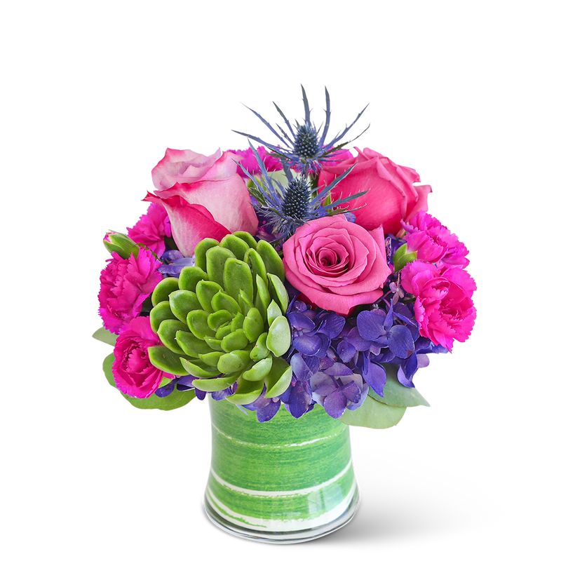 Delight in the rich purple tones of one of our floral favorites, London Posh with Succulent. A chic, leaf-lined vase with hydrangea, roses, carnations, succulent, and premium foliage makes up this gorgeous floral design. This vibrant flower arrangement will brighten anyone's day and add a pop of color to any space.