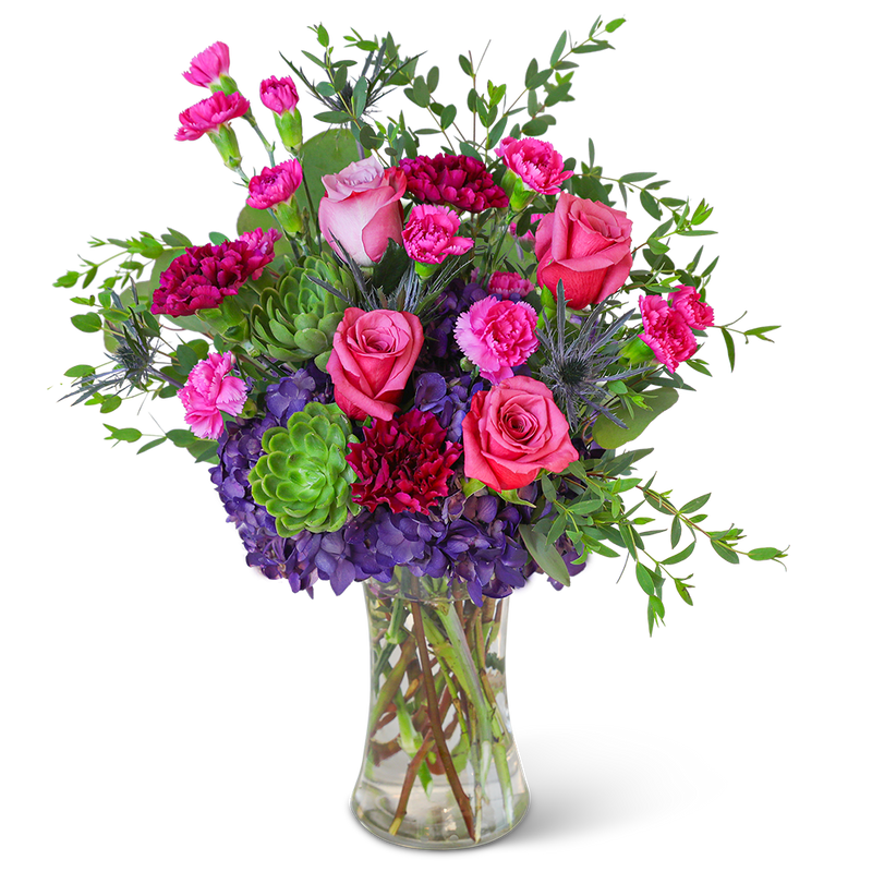 Delight in the rich purple tones of one of our floral favorites, Love in London with Succulents. A tall, chic vase with hydrangea, roses, carnations, succulents, and premium foliage makes up this beautiful floral design. This vibrant flower arrangement will brighten anyone's day and add a pop of color to any space. It would make a perfect Anniversary or Birthday gift for that special someone.